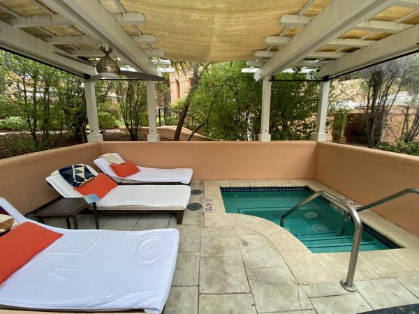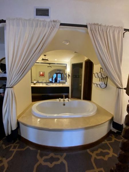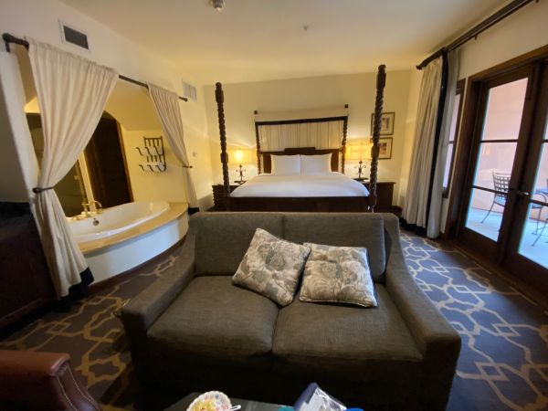 If you are lucky like we were, you’ll be rewarded with an early check-in time, and snagging a suite is well worth your investment. We are on the third level in the Mission Spa suite, featuring a four-poster king bed, so tall management has placed a step stool on one side to give guests a boost. That is a good thing because at night I have to fling myself onto the bed. My husband fears he may forget that the bed is high and fall out in the middle of the night. But he doesn’t.