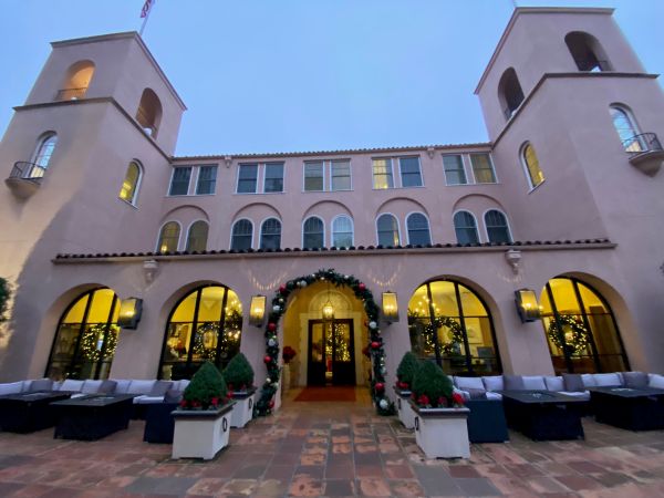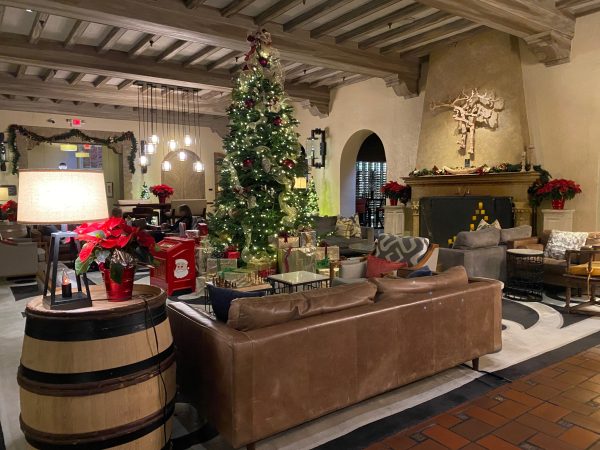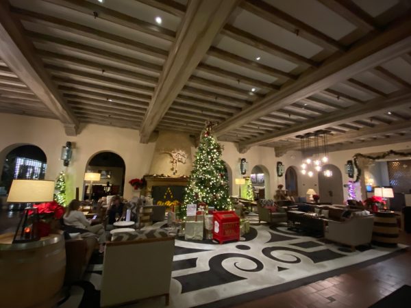 Lobby swags of greenery and miniature trees are such a joyous sight, especially for those of us relieved we don’t have to de-Christmas this room after the holidays are over. Do take a moment to admire the Spanish motifs and materials such as wrought iron railings, tiled floors, and exposed wood beam ceilings.