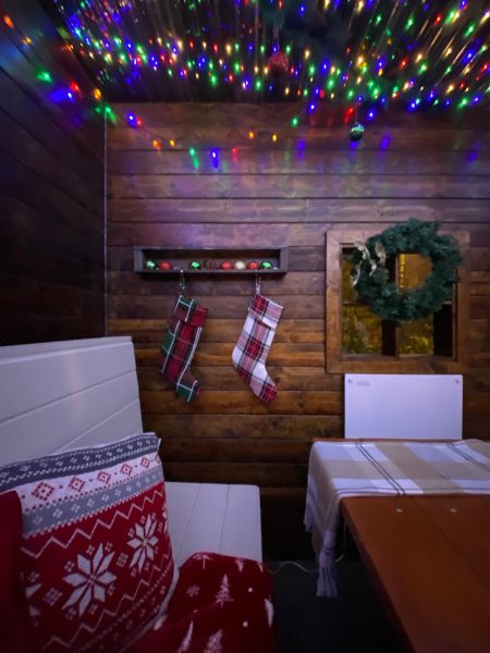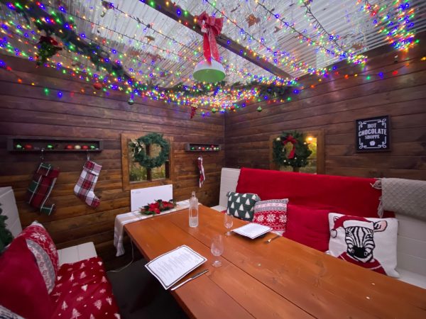 Located in the front of the hotel, the boxy rooms are filled with a picnic table and benches layered with blankets and sweater pillows. Meanwhile, walls are festooned with ornaments and the ceilings dripping with starry lights. Each possesses its own decorative spin. Ours is lined with colorful lights above and that pillow with a zebra wearing a Santa hat beckons me to come. Here, the chalet menu is separate from the hotel restaurant, featuring seven entrees and three desserts. I do recommend the smooth and stretchy cheese fondue with bread, apples, pears, and grapes. I toast my man with the festive eggnog spiked with rum while Frank clinks my glass with his Pumpkin Spice & Everything Nice espresso cocktail.