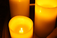 Now to search the garage for batteries. After installing the batteries, I look carefully at the bottom of each candle. There is an on – off – timer button and one that you can program for 4 hrs – 6 hrs – 8 hrs (8 hours? Yikes, that’s a LONG night of setting the mood…just sayin…).