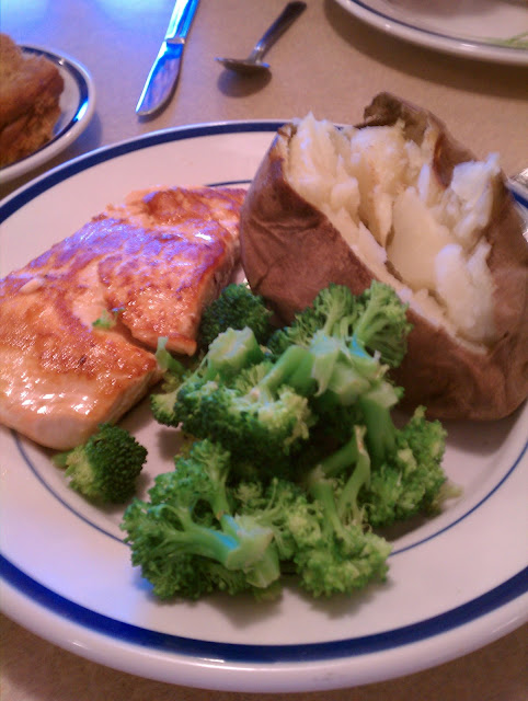 Of course my hubby HAD to order the chicken pot pie (NOT on the Fit from the Farm menu) and torture me, but I enjoyed my grilled salmon with a baked potato and broccoli for around 480 calories without feeling deprived. There was SO much food on my plate that I could only eat a little more than half of it. The hard part was pushing away Bob Evans’ breads.