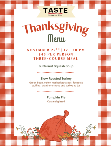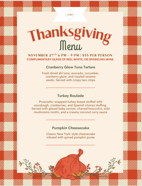 Thanksgiving Day Dinner (Nov. 27, 6–9 p.m.) — $55 per person with complimentary wine