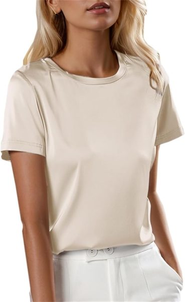 Two tops — one casual (silk tee, luxe cotton shirt) and one elevated (silk blouse or fitted knit)