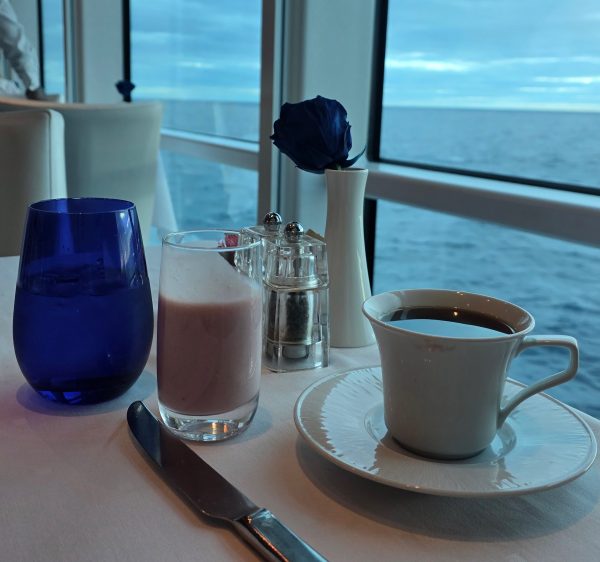 From the moment I stepped into my AquaClass stateroom, I felt taken care of. All AquaClass cabins on Reflection are Veranda staterooms (or suites), which already sets the tone. Natural light. Fresh air. That quiet moment in the morning when you slide open the door and remind yourself that yes, you are really at sea. Inside the cabin were all the little details that make AquaClass feel different. Daily bottled water waiting for me. Two yoga mats were tucked neatly away so I could stretch without improvising on the carpet or having to pull one from the fitness center. Binoculars ready for sail-aways and shoreline views. And waiting in the refrigerator, a perfectly chilled bottle of sparkling wine. It was a small thing, but it felt celebratory. Like the ship was saying, welcome back, slow down, we’ve got you.