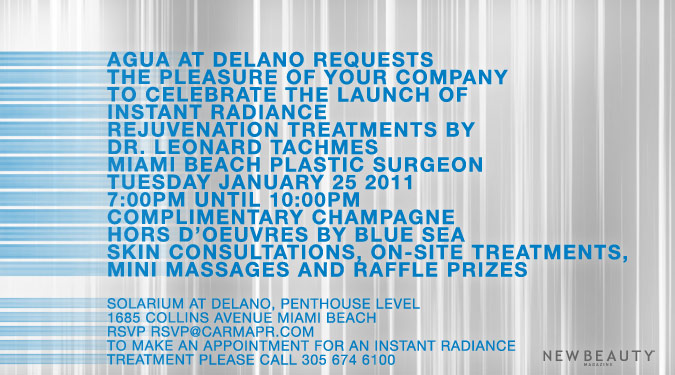 If you just happen to be in the Miami area, you might want to RSVP for this FABULOUS event at the Delano (yes THAT Delano). Massages, skin consultations, on-site treatments and of course some bubbly and a little snack to hold you while you’re learning how to look GREAT.