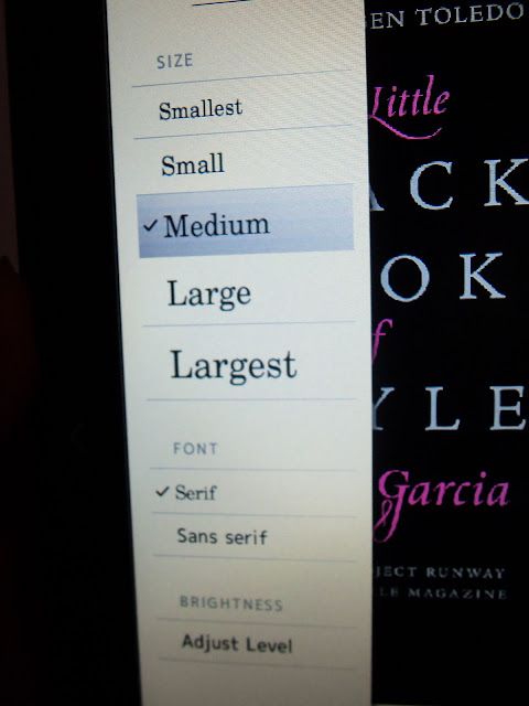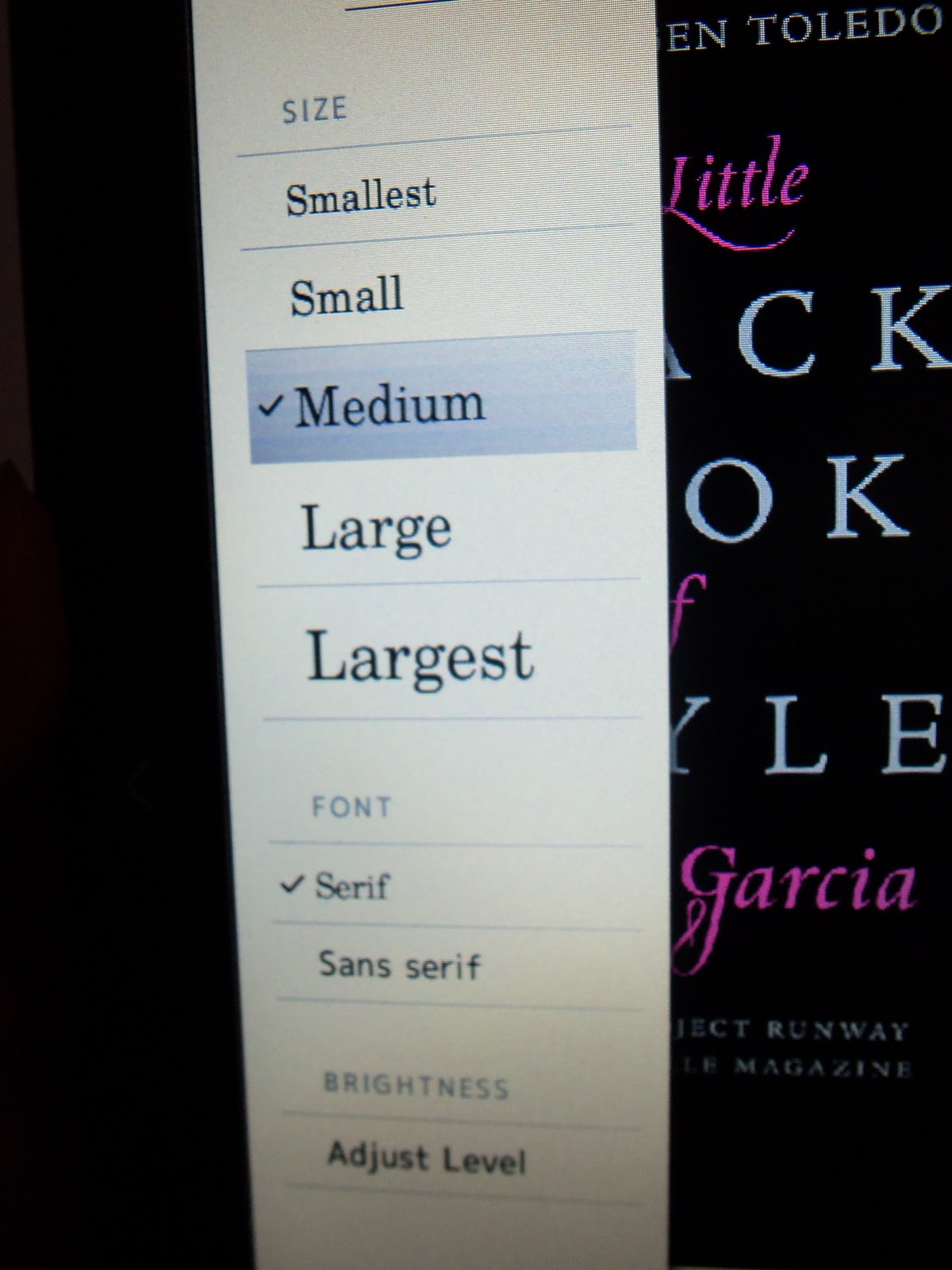 There are large arrows on the frame allowing you to move forward and back, making reading a seamless experience, and you can control the font, the size of the font and making it so that many people who need reading classes can read WITHOUT THEM (great for someone like me who hates putting on my reading glasses when I’m wearing contacts).