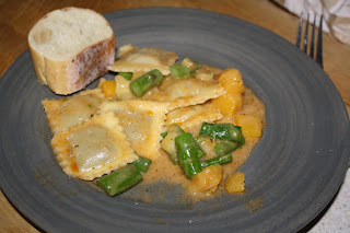 I tried the Pumpkin Squash Ravioli. I love the fact that it is made with real extra virgin olive oil, and pumpkin ravioli that is covered in a butter-sage sauce, asparagus and butternut squash. If this doesn’t sound like your typical microwave meal, you’re right. I actually ENJOYED eating it (and as you can see from the pictures – I HAD to have a slice of fresh French bread to sop up the remainder of the delicious sauce).