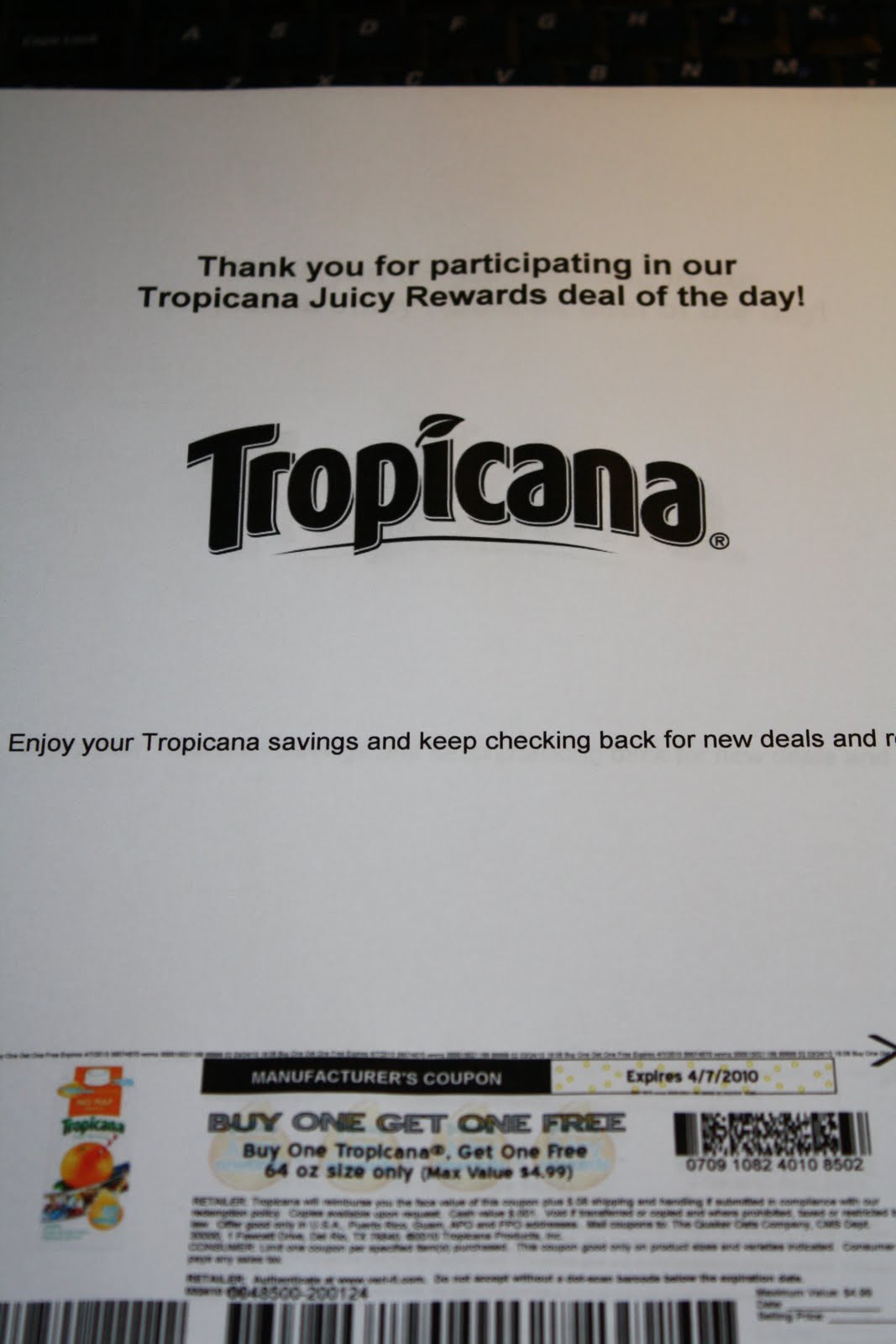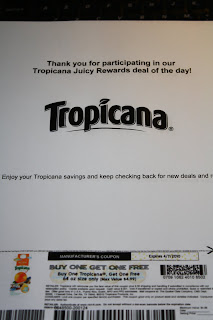 This week, I noticed that Tropicana was offering a DEAL of the DAY – a BOGO (buy one/get one free) coupon for Tropicana products (for only one point). Since I buy at LEAST 2 cartons of Tropicana Juice every week, I JUMPED at the chance for extra savings.