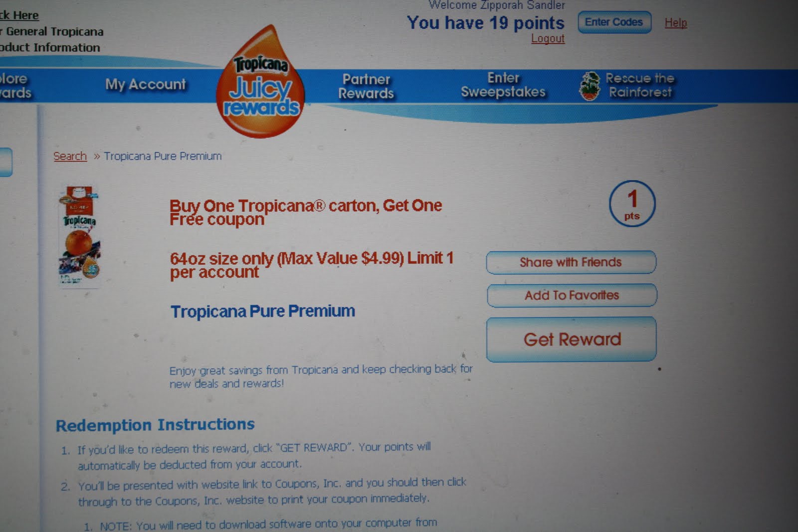 1. I clicked on the reward that I wanted – the Buy One Tropicana carton, Get One Free coupon. As you can see, it’s only ONE POINT!