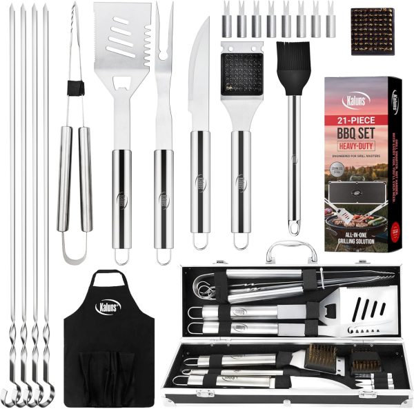 It’s no wonder there are 2,500 delighted users that have hailed it as Amazon’s Choice, this comprehensive set equips you with all the necessary tools for an extraordinary grilling experience: a robust stainless steel spatula, tongs, skewers, a grill brush (complete with an additional head), and a four-pocket apron—all elegantly kept in a chic aluminum case.