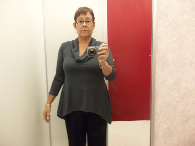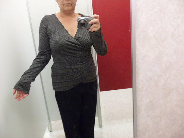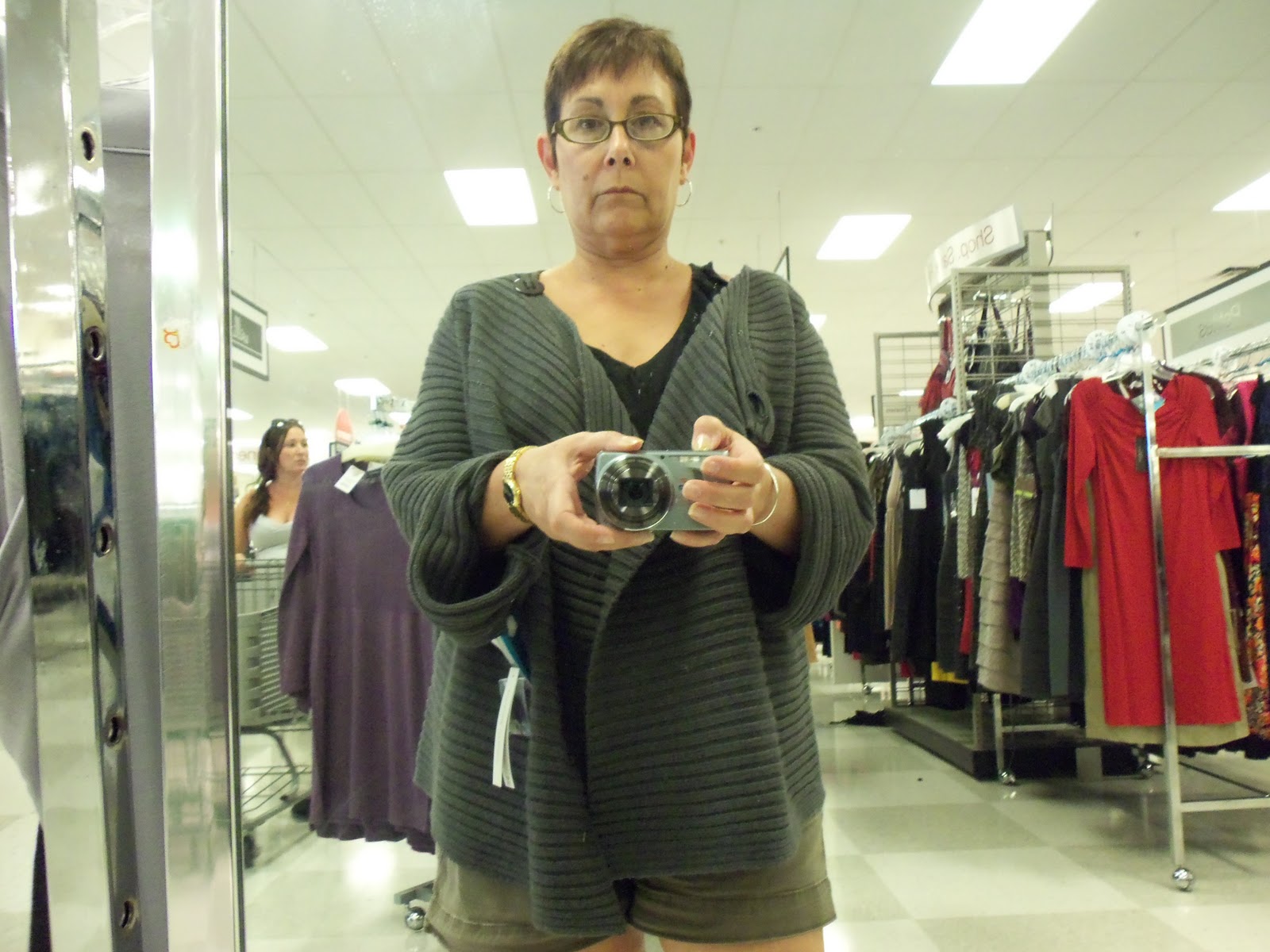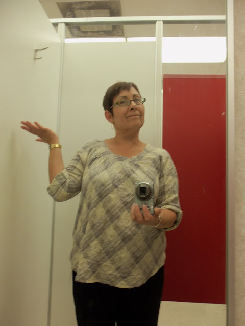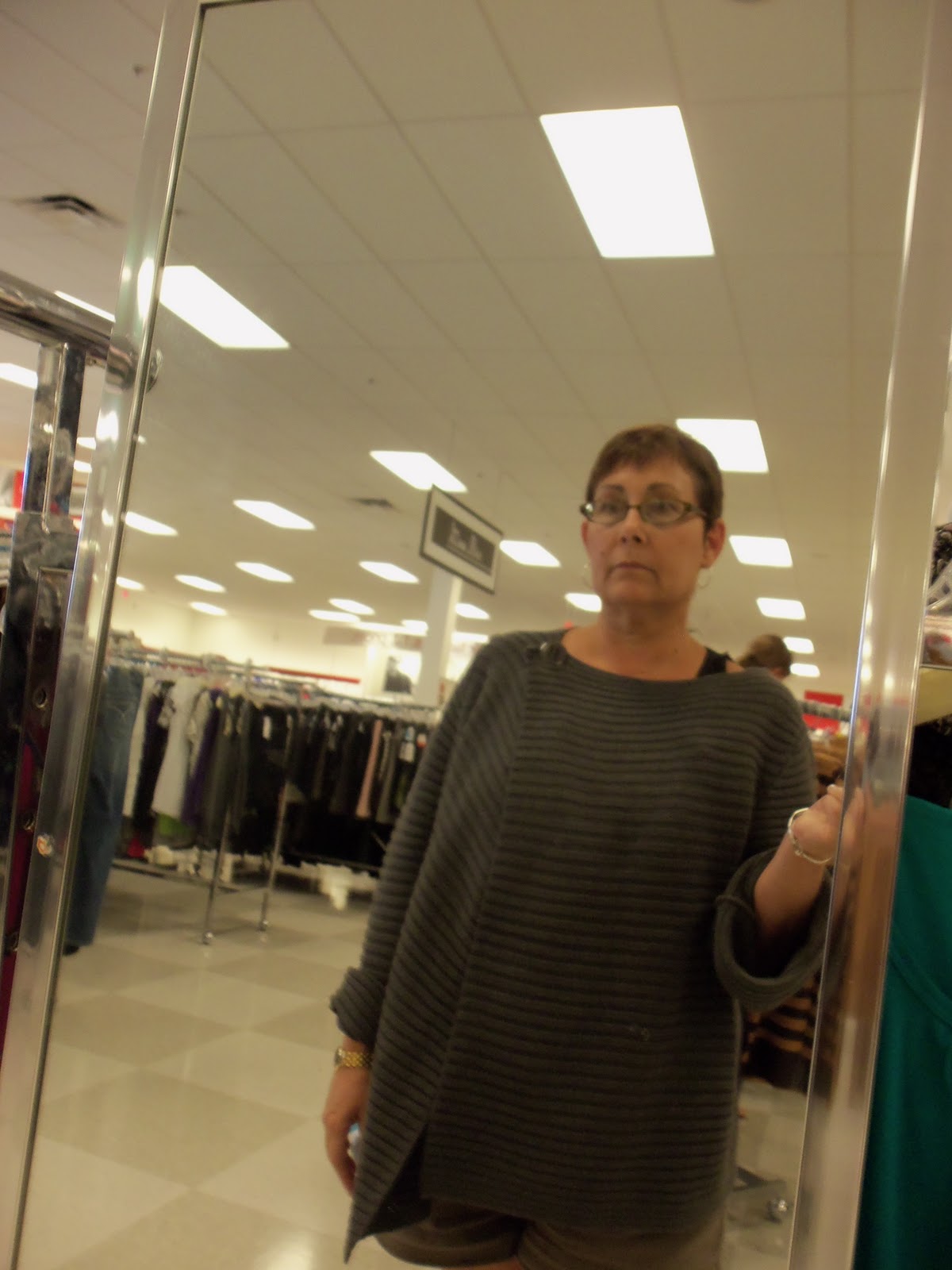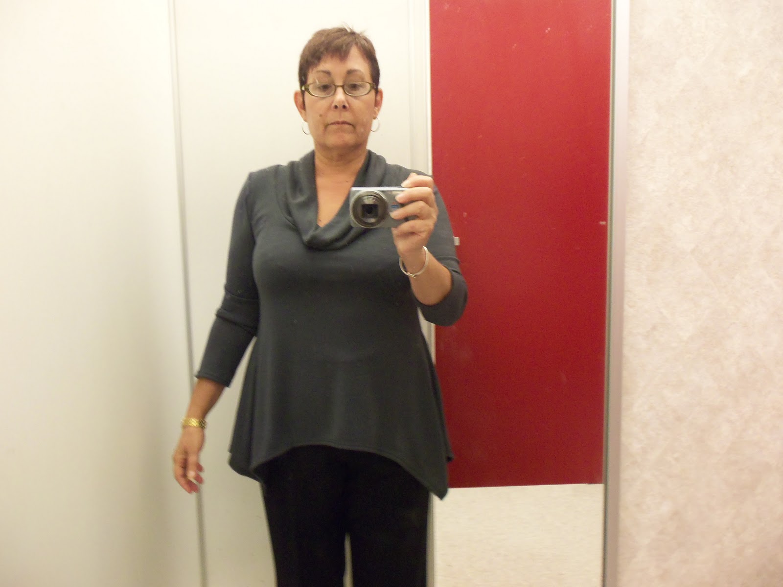 I tried on a LOT of tops. I’m short and no longer thin, so I always have to try on a LOT of different styles and lengths to see what looks best on me. They had (as always) a HUGE selection. So off I went to the dressing room to try on lots and lots of shirts.