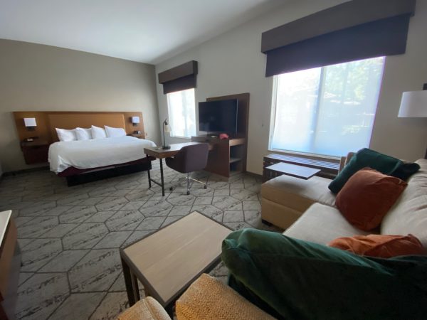 The Hampton Inn is the most comfortable lodging option near downtown. Among the 116 rooms and suites to choose from, I highly recommend booking a suite, terrific for spreading out. The open living room and bedroom concept also features a compact entryway with a microwave and refrigerator, and a separate sink, ideal for keeping snacks or warming up meals. I typically ask hotel staff to bring these items in anyway.