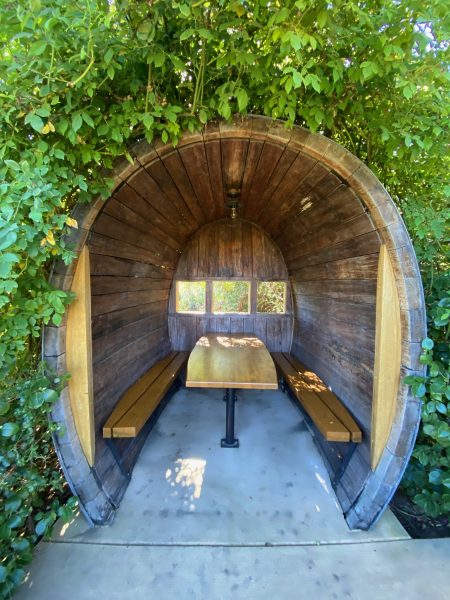 Find out when they offer wood-fired pizza, as it is available on a pop-up basis. Secure the secret outdoor table inside the shape of a giant curved wine barrel. Walls are made of repurposed barrel slats.