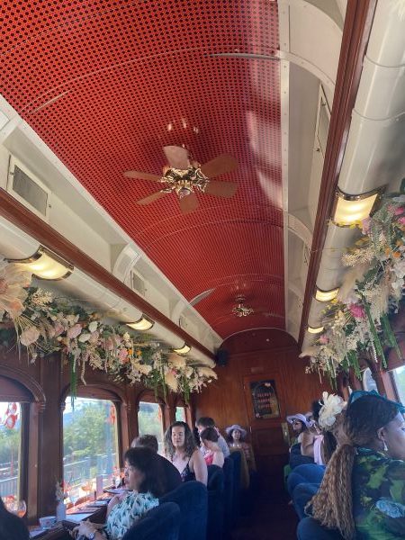 Of the connected cars on the wine train, only the Chandon tea car is festooned with silk flowers amid red-orange walls, velvet navy swivel chairs, and gold dining booths. Once seated, servers offer a refreshing Garden Spritz, an aperitif which is the result of a partnership with Chandon, a major maker of bubbly in Napa Valley. The drink consists of Chandon sparkling wine, plus a Chandon liqueur made of oranges, spices, and herbs.