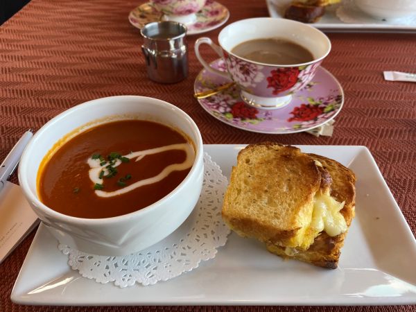 The order of the day begins with tomato soup with a gourmet cheese sandwich, followed by a selection of bite-sized savories. A tray of sweets concludes the meal.