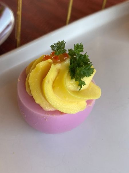 Tea lovers can appreciate the aesthetic beauty in food presentation. In my mind’s eye, I picture a chef with long tweezers placing the chive strands and gold leaf bits perfectly atop each bite. Using a ruler or compass to ensure perfect symmetry? Perhaps.