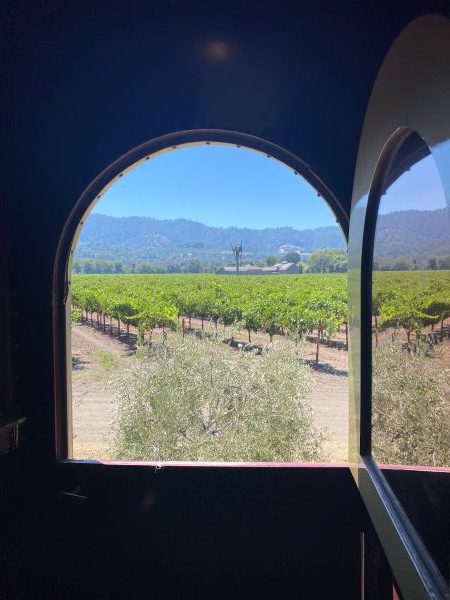 Meanwhile, the ride itself is nostalgic and peaceful. As you admire your complimentary wine train tea pin, you roll past vineyards and wineries, and glean some valley trivia. Each car holds limited passengers, so you can chat with one another without shouting. The locomotive noise is subtle, in the background. Once you get to the terminus after 18 miles, the train stops, changes gears, and backtracks without turning around. Three hours go by quickly. You enjoy the tracks, food, and beverages, and uninterrupted conversation, just like train passengers did in the pre-airplane days.