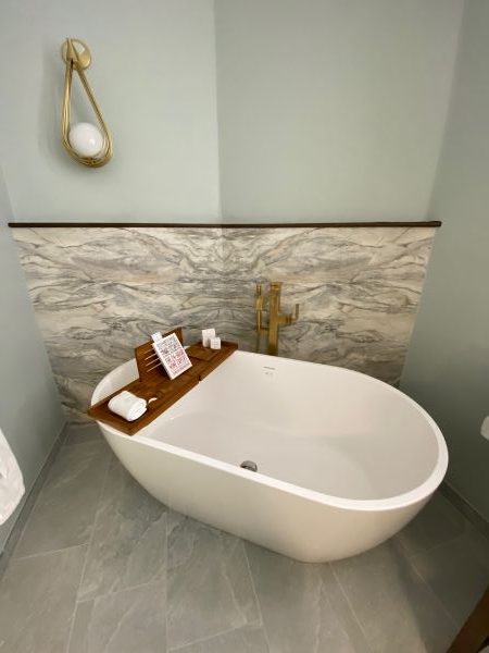Designer bathrooms will spoil you. Gold and white marble showers and fluffy towels set the stage for Byredo, vegan Scandinavian toiletries. That brand’s subtle pine needle scent in the lotions and soaps is called Gypsy Water, which is so intoxicating you’ll probably purchase it at the gift shop. If you are a lover of the spa life, request a room with a soaking tub. You can bet I took advantage of a dreamy soak in Room 126. The bath tray with a wine book and Byredo salts was the crowning touch.
