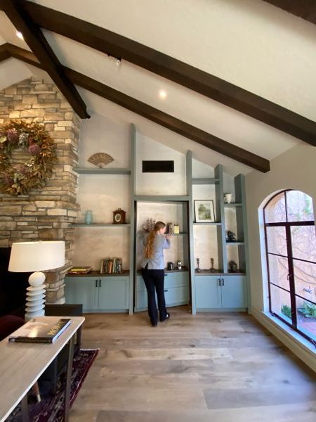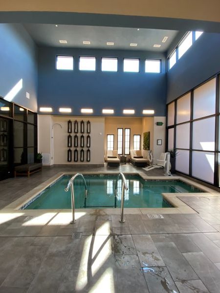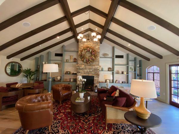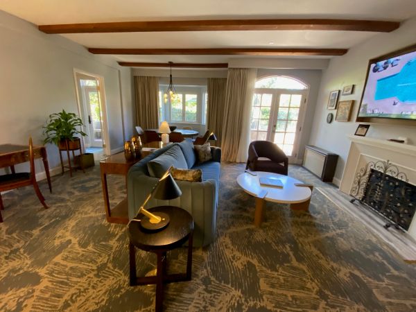 The desk manager welcomes every guest with a glass of sparkling wine. As you sip, you can appreciate this re-invented lobby that was labored over relentlessly in terms of features and design. A boxed olive tree soars up to the skylight. Walls of windows usher sunshine into a living room with a roaring stone fireplace. The muralled space is open 24 x 7, so you can enter to relax at any time. Fun fact: a secret door in one of the murals opens to a gym. Another fun fact: one of the living room bookcases doubles as a secret door leading to a game room with billiards.