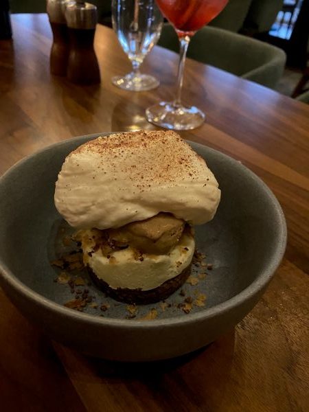 For dessert, hands down, it’s the tiramisu served deconstructed. The bowl arrives with a hat of cappuccino foam, followed by a scoop of espresso ice cream, and coffee-dipped cookies.