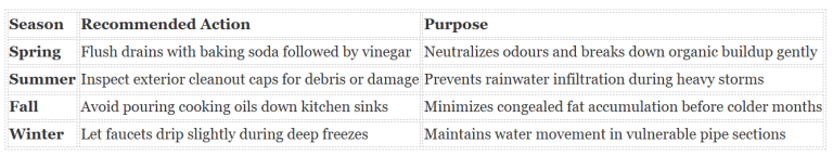 - Late fall: Addressing slow drains before deep freeze prevents ice amplification of existing blockages